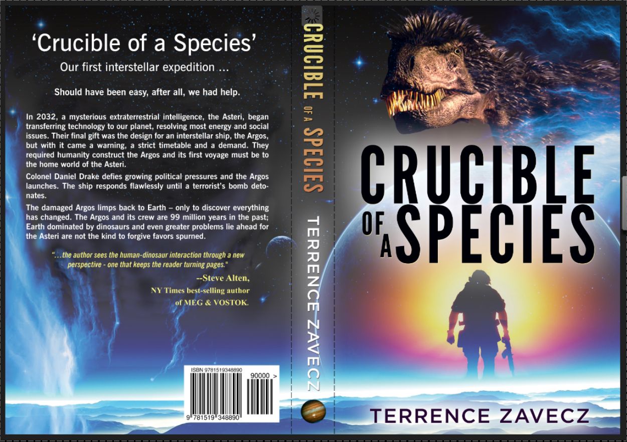 Crucible of a Species (The Crucible Series) (Volume 1) This is a highly readable book with an engaging ship's crew of politically divergent characters on a peaceful mission of discovery. Well-crafted plot with the inevitable conflict that comes when you mix a crew of soldiers, scientists and civilians under the autocratic command of the military. Think of Sagan's "Contact" (one of my favorites), where benevolent aliens provide the technology to enable interstellar travel. Mix in rampaging dinosaurs a la Crichton with elements of Herman Wouk's 1954 classic "The Caine Mutiny". Mix these elements with a mission through space and time using worm holes predicted by Einstein and with the latest concepts of quantum mechanics and string theory.